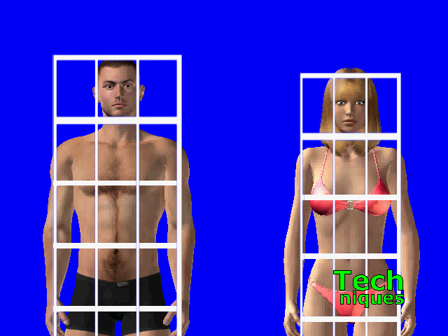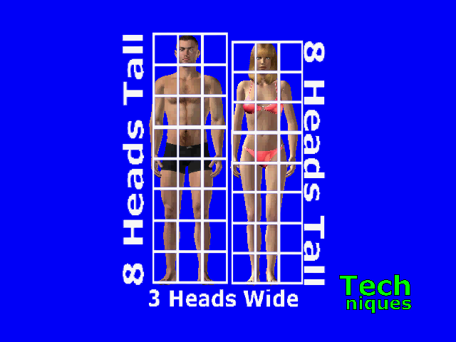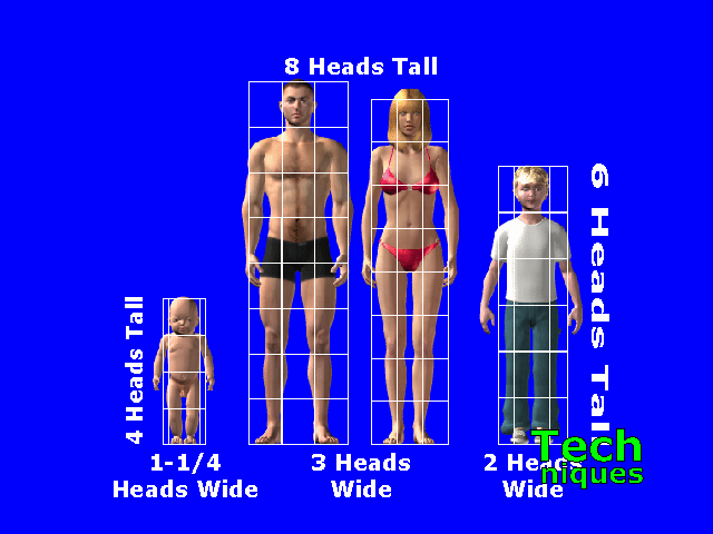 Adult figures are 8 head-lengths tall and 3 head-widths wide.
