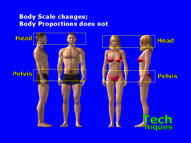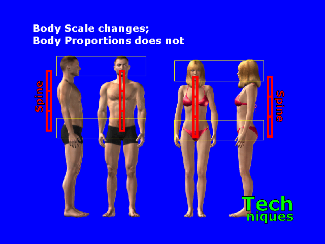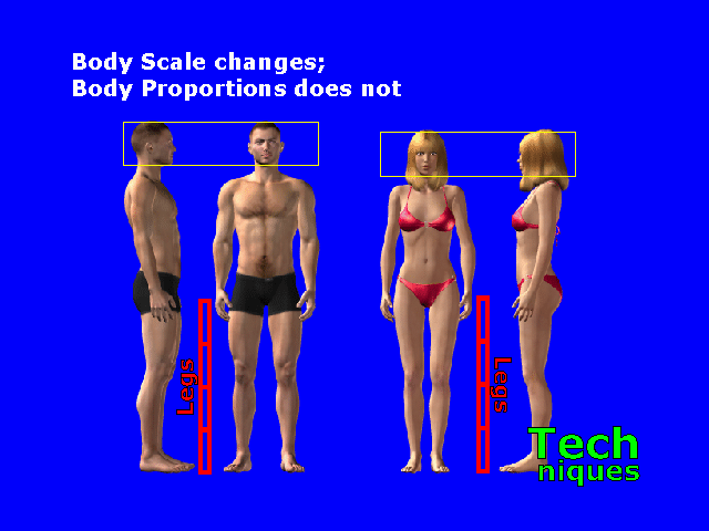 Changing the size of the body does not change the relative sizes of body parts. Changing the body size allows for different physiques: