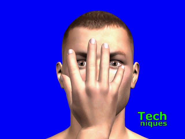 The hand extends from the chin to the middle of the forehead (where the third eye would be).