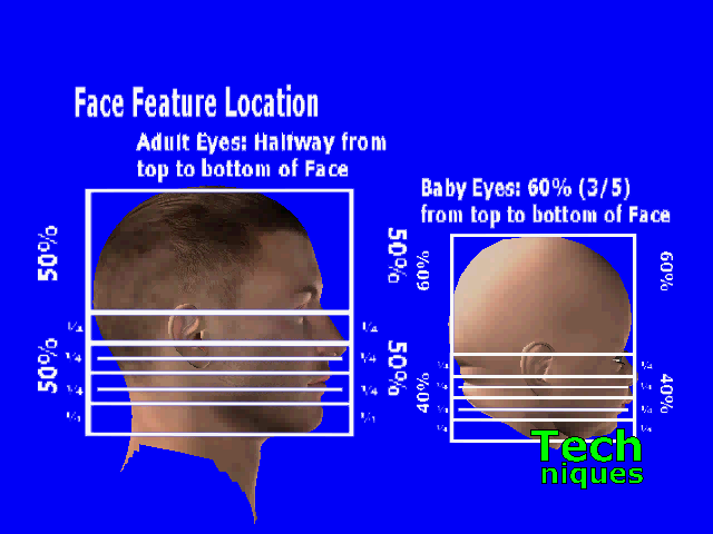 The facial features also have proportional locations. For an adult, the eyes are exactly halfway down the head. In the drawing, the bottom of the head has been divided into fourths and eighths. The nose and mouth are located as shown in the drawings.