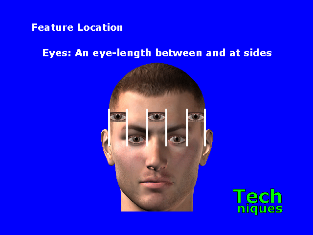The size of the eyes is proportional to the width of the head. There is an eye-length between the eyes, and another eye-length at each side.